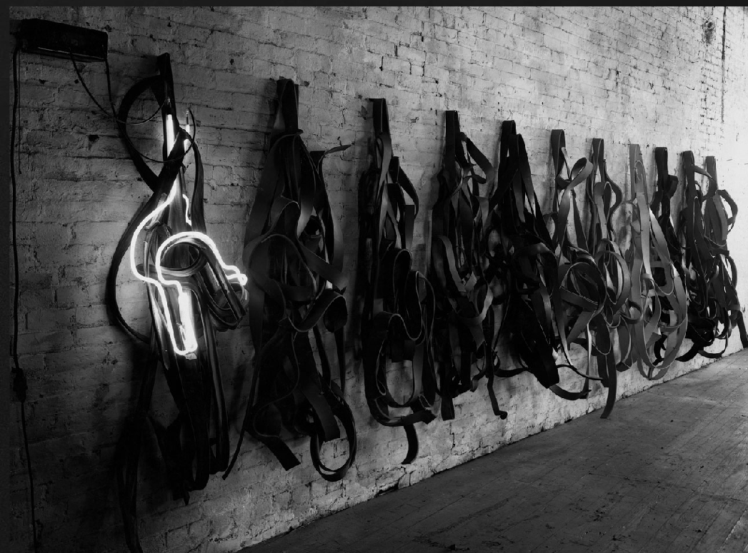 Belts, 1966-67. Vulcanized rubber, and neon tubing. 6’ x 25’ x 20” (182.9 cm x 7.6 m x 50.8 cm). Solomon R. Guggenheim Museum, New York. Panza Collection